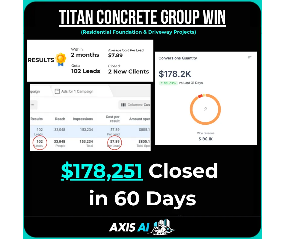 Revenue Jump: With a $5,000 ad budget, Titan Concrete Group added $178,251 in new project revenue in just 60 days.
